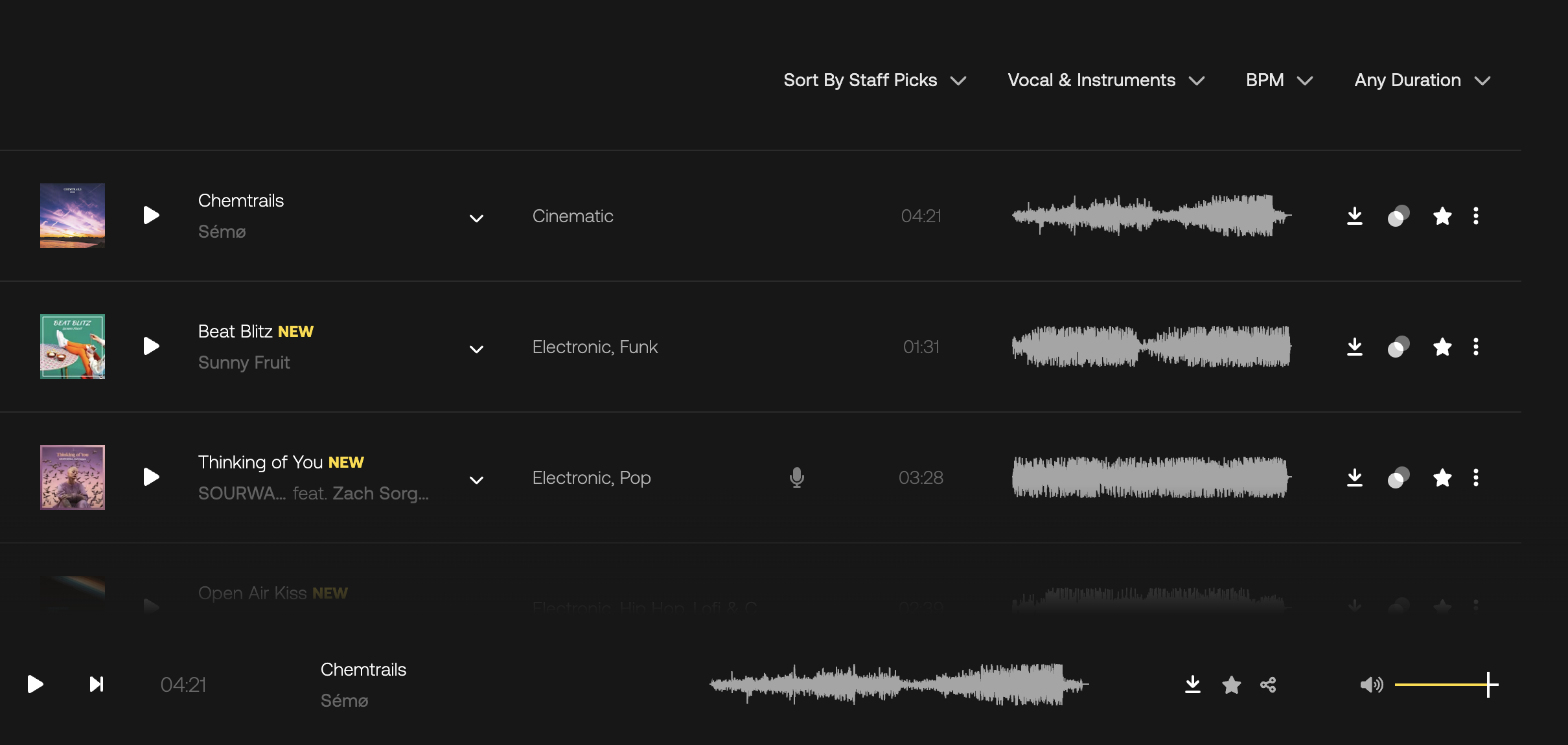 Il vous suffira de vous rendre dans la barre du haut, où vous pourrez trier par Choix de l’équipe, Meilleurs téléchargements ou Plus récents. L’option de tri suivante est Voix & instruments. Vous pourrez choisir d’écouter les morceaux avec des voix ou seulement des instruments.