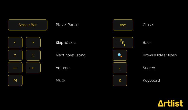 やるべきことはただ一つ、魔法のキー「K」を押すだけです。これで、Artlistで使えるすべてのショートカットが表示されます。