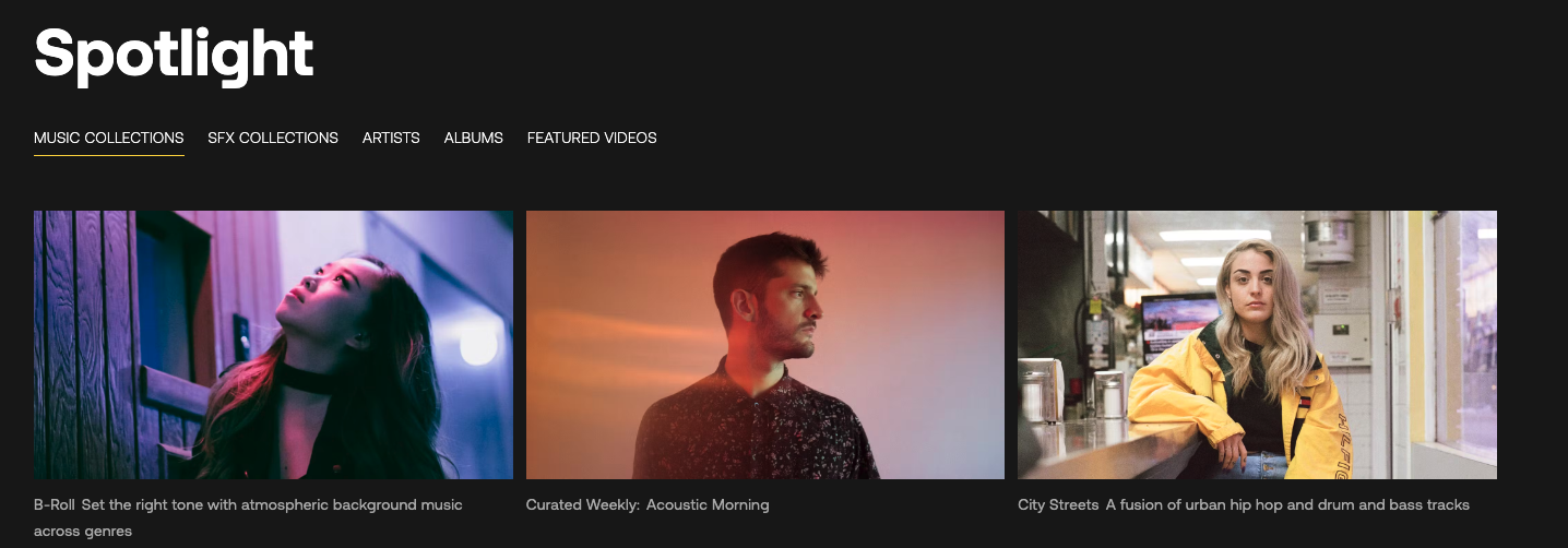 インスピレーションが欲しいと感じたり、同じような音楽ばかり使っていると感じることはありませんか?そんな時はご安心ください。誰もがそう感じることがあります。だからこそ、スポットライトページを用意しました。毎週「Curated Weekly」セクションで新しいインスピレーションをお届けします。人気のテレビ番組やポップカルチャー、季節ごとのテーマなどに基づいたプレイリストを毎週更新していますので、ぜひチェックしてみてください。